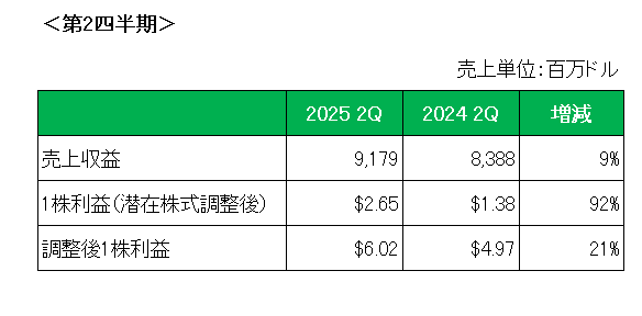 直近の業績ですが8月5日にリリースされた2025年第2四半期決算は製品売上高が販売価格は3%下落したものの販売数量の13%増加が牽引役となり9%増加したことにより前年同期比で増収(+9%)。
