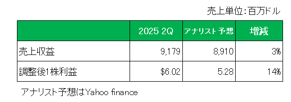 またアナリスト予想との比較では以下のとおり売上、調整後1株利益ともに予想を上回っています。