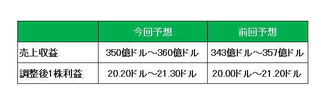 そして今期2025年の通期見通しですが、以下のとおり前回見通しの売上:343億ドル~357億ドル、調整後1株利益:20.00ドル~21.20ドルに対し、売上:350億ドル~360億ドル、調整後1株利益:20.20ドル~21.30ドルと売上、利益ともに上方修正しています。
