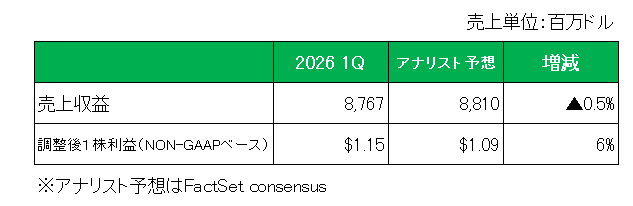 ただアナリスト予想との比較では以下のとおり売上は若干予想を下回ったものの、調整後1株利益は予想を上回る結果となっています。