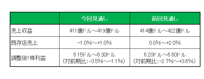 最後に注目の今期通期見通しですが、以下のとおり前回見通しの売上:414億ドル~422億ドル、既存店売上:前期比0.0%~+2.0%、調整後1株利益:6.20ドル~6.60ドルに対し、売上:411億ドル~419億ドル、既存店売上:前期比-1.0%~+1.0%、調整後1株利益:6.15ドル~6.30ドルにそれぞれ下方修正しています。