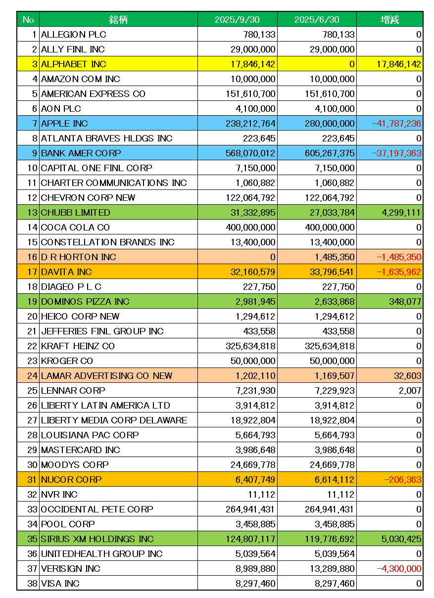 現地時間の11月14日、2025年9月末時点のバークシャー・ハザウェイ(バフェット)の上場株式保有状況がSEC(米証券取引委員会)に開示されていましたので、早速いつものとおり比較表を作成しました。