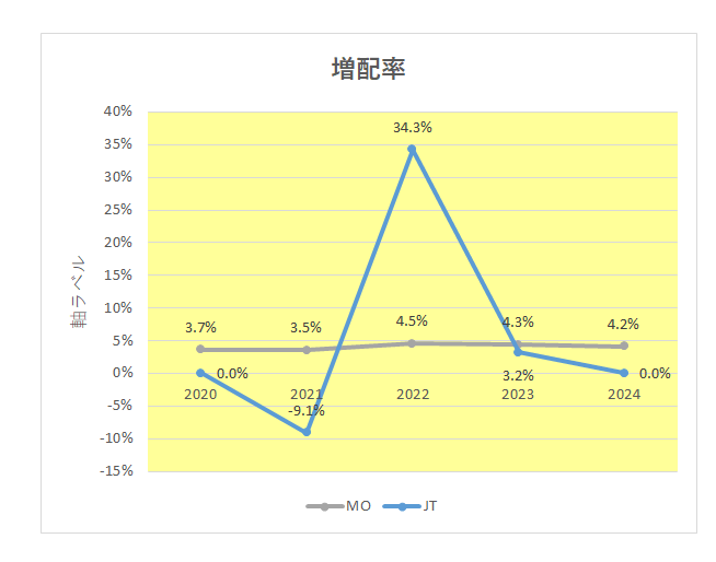 アルトリアが安定的に3%台から4%台の増配を継続しているのに対し、JTは2020年、そして直近2024年は増配をしなかったばかりか2021年には154円から140円へと減配(-9.1%)、しかし翌2022年は140円から188円に大増配と安定感に欠けると言わざるを得ません。