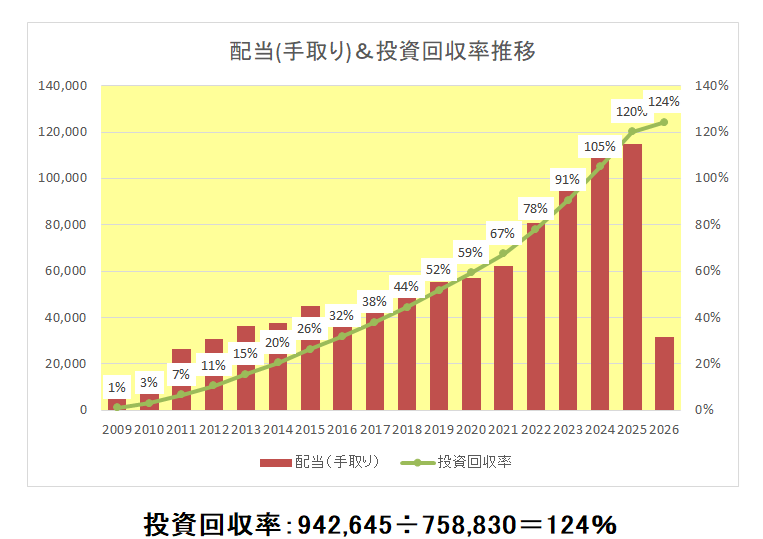 現在までの配当金の積み上がり状況は以下のとおりとなっており、総投資額約75.8万円に対する総配当受領額は94.2万円、投資回収率は124%とアルトリア(MO)に続く100%超え銘柄となっています。