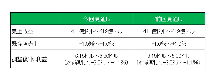 そして今期通期見通しですが、関税をめぐる不確実性を理由に以下のとおり前回引き下げた見通し、売上:411億ドル~419億ドル、既存店売上:前期比-1.0%~+1.0%、調整後1株利益:6.15ドル~6.30ドルを維持しています。