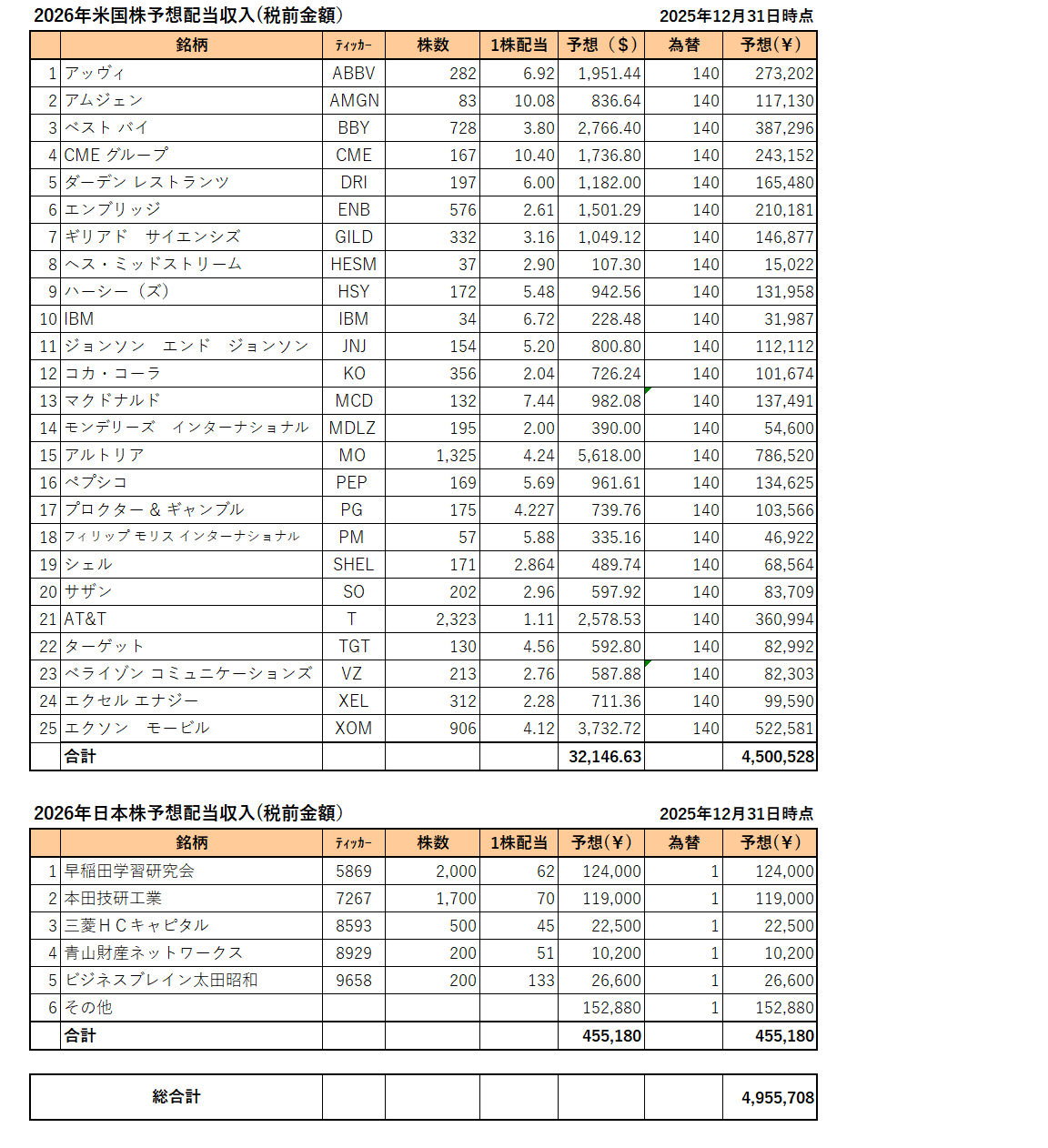 こちらの表は左から銘柄、ティッカーシンボル、株数、1株配当、予想配当($)、予想為替レート、予想配当(円)となっています。
