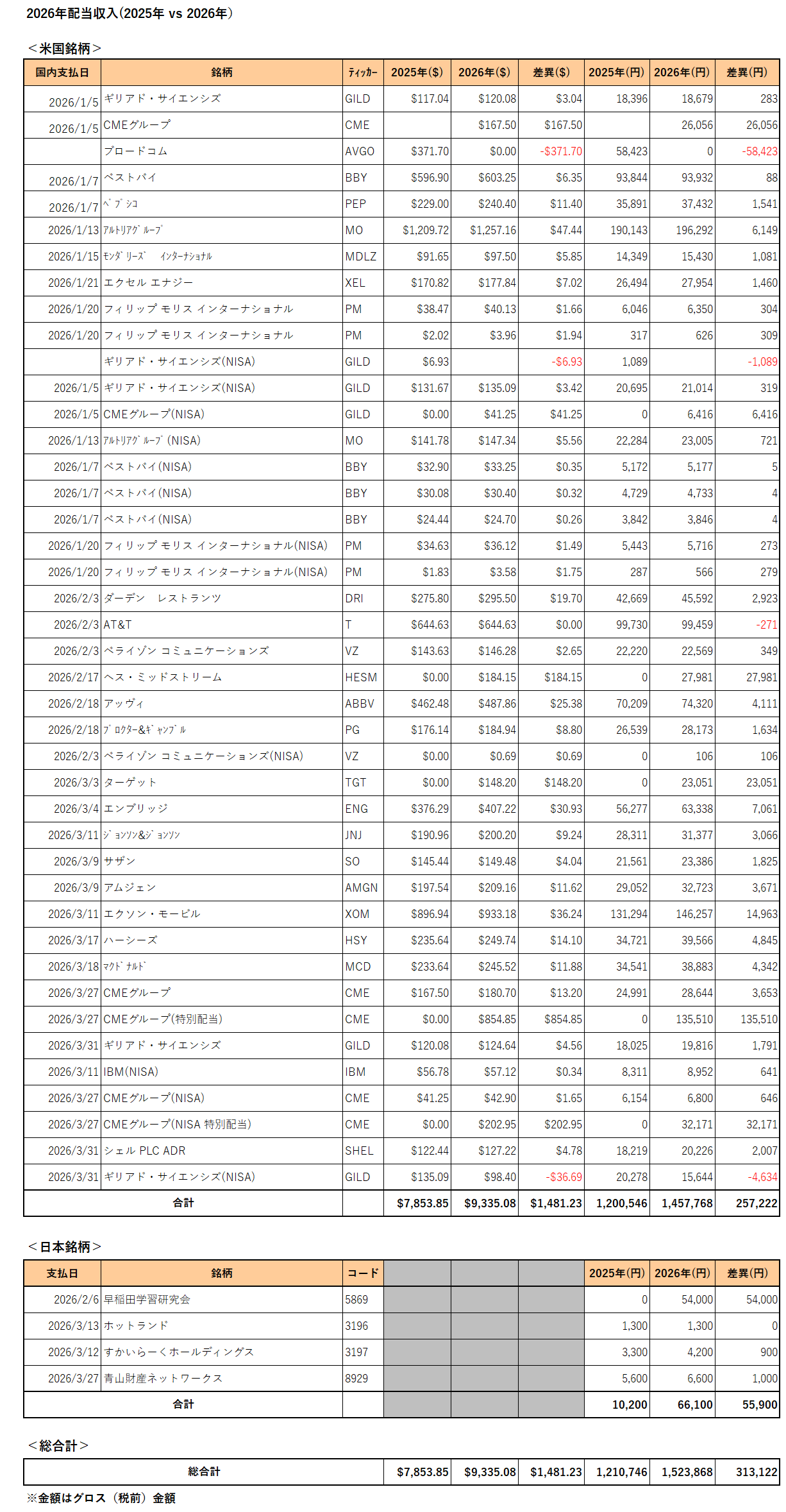 表は前年2025年と比較しており、米国株の場合左から2025年ドル金額、2026年ドル金額とその差異金額、2025年円金額、2026年円金額とその差異金額となっており、いずれも税引前(グロス)金額です。