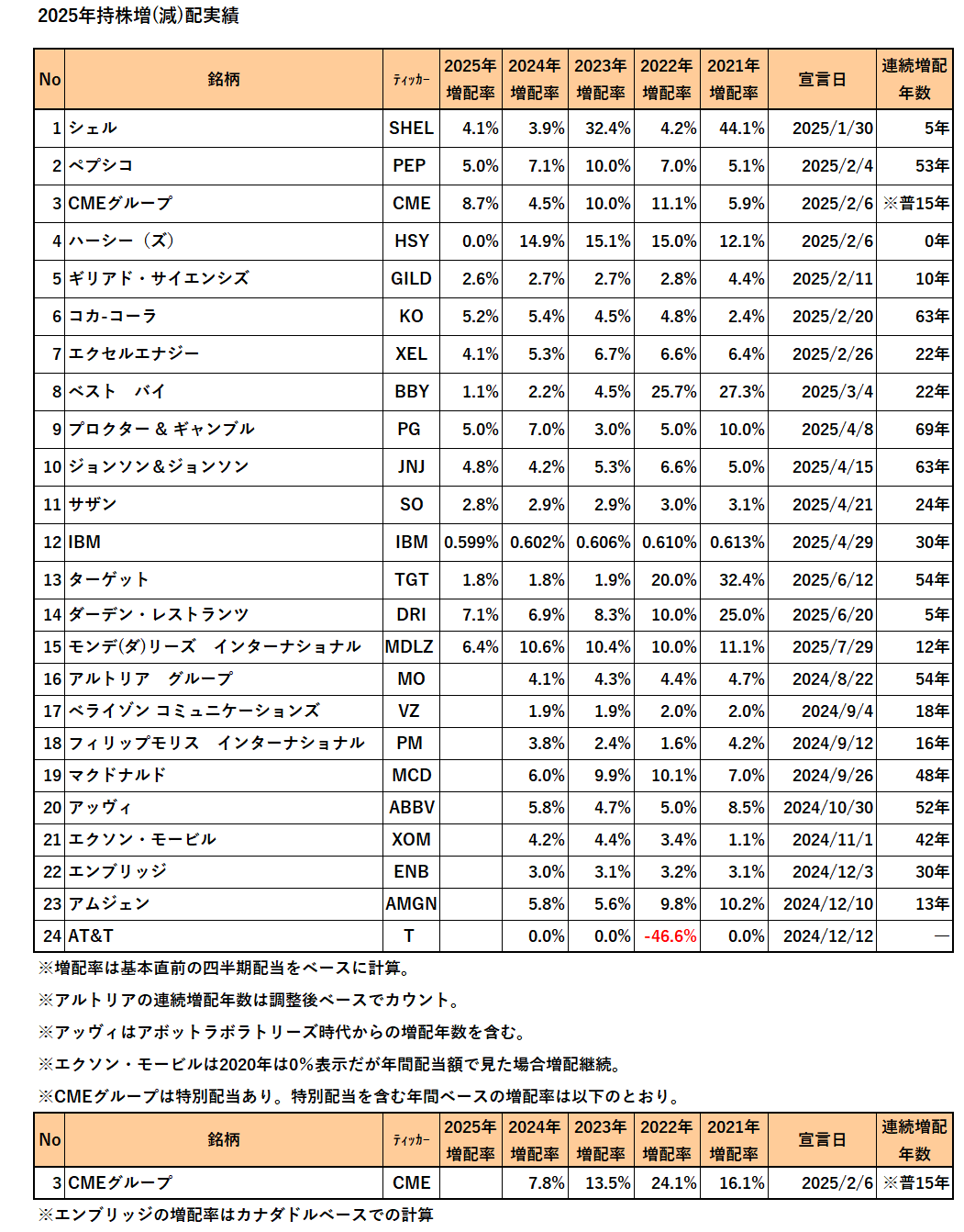 早速ですが7月末現在の持株(米国株)増配率一覧表を作成しました。