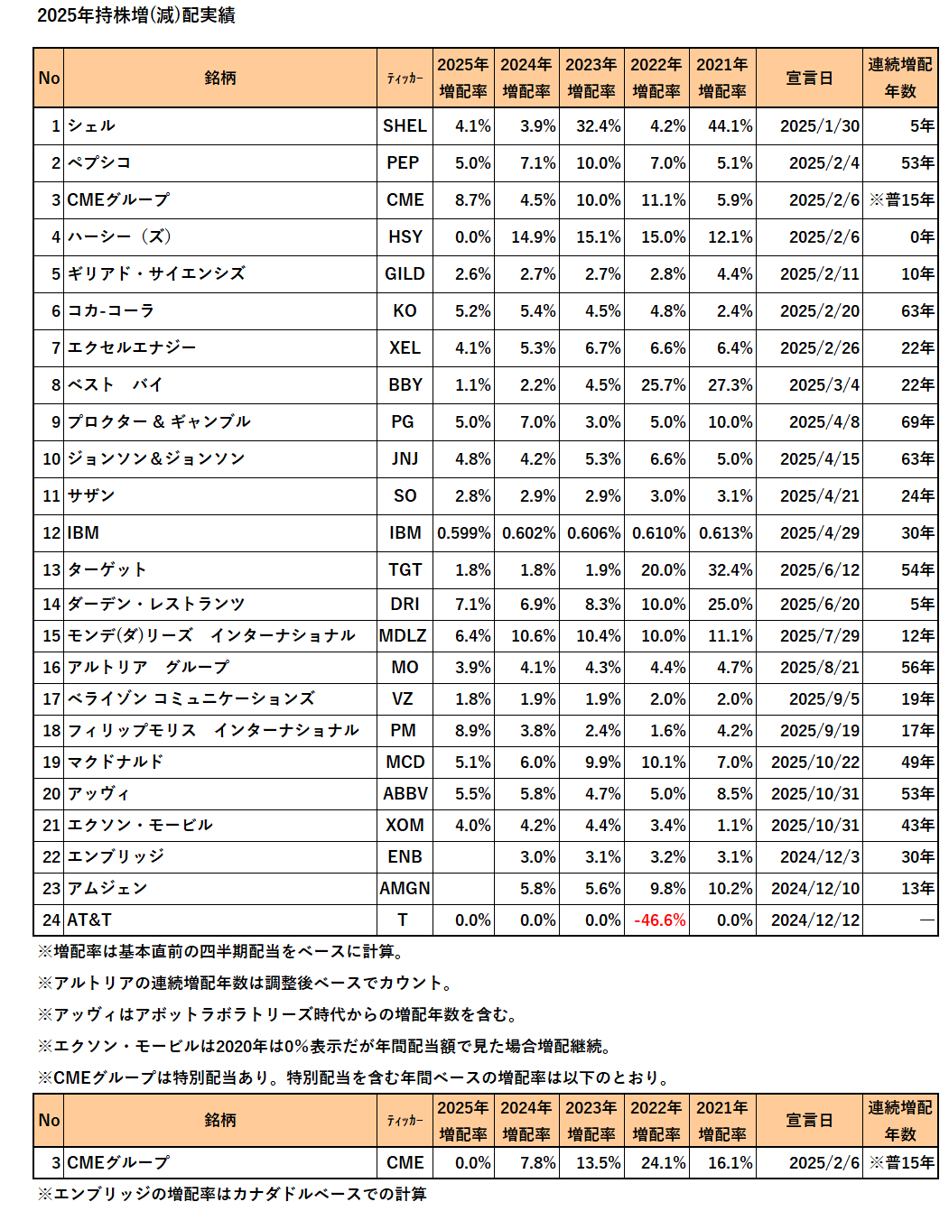 持株(米国株)増配率一覧(2025年10月末時点)を公開します