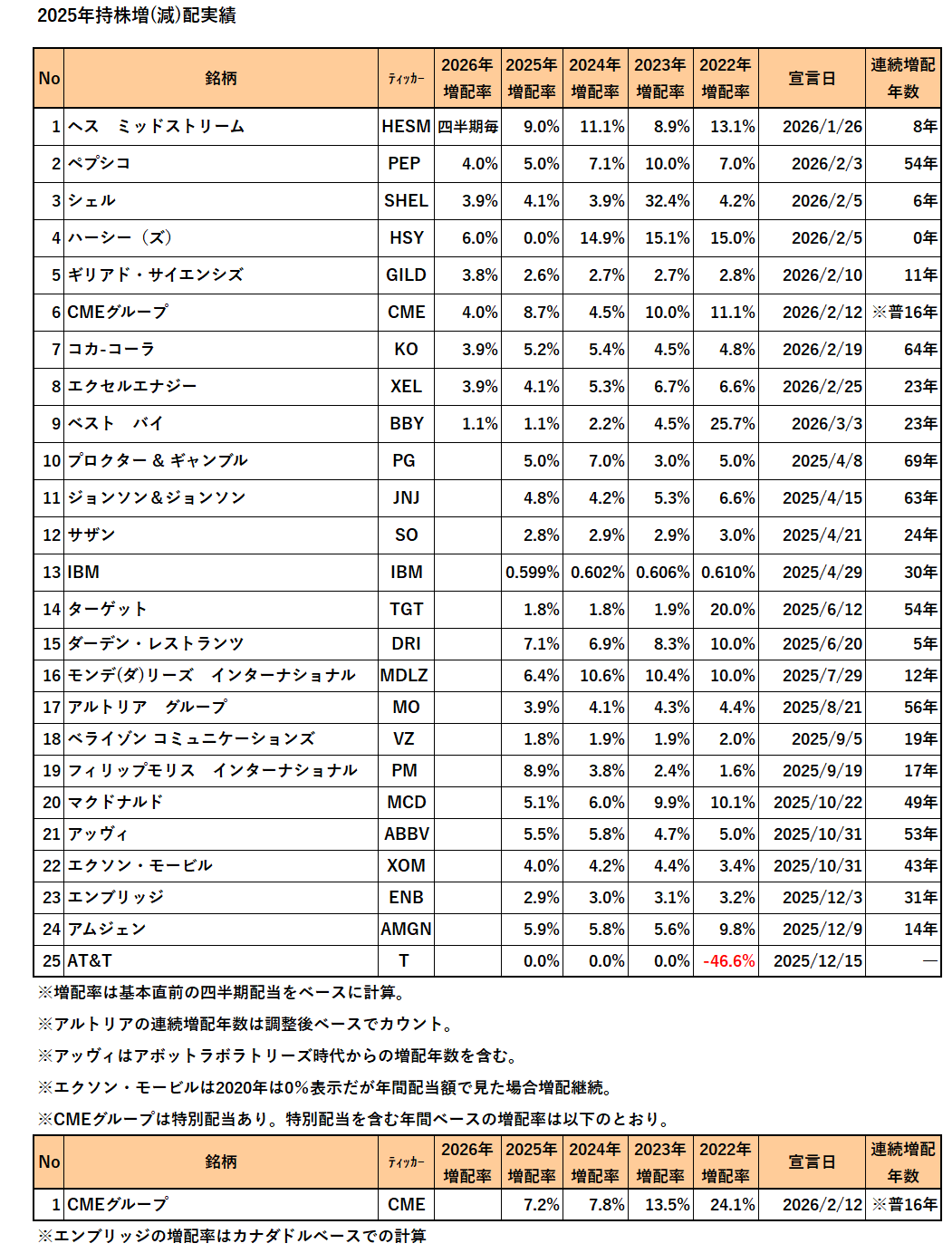 早速ですが2026年3月末現在の持株(米国株)増配率一覧表を作成しました。