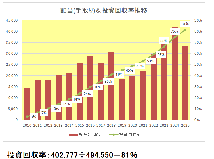 その結果クラフトフーズの時代を含む過去の配当の積み上がりは以下のとおりとなっており、総投資額49.5万円に対する総配当受領額は40.3万円。