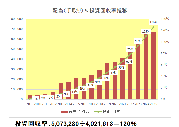 昨年(2024年)5月の支払いですでに投資回収率が100%を超え、いわゆる元が取れたこの銘柄ですが、投資回収率はすでに126%まで来ています。
