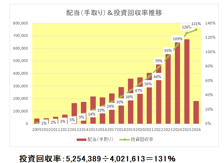 すでに投資回収率が100%を超え、いわゆる元が取れたこの銘柄ですが、投資回収率はすでに131%まで来ています。