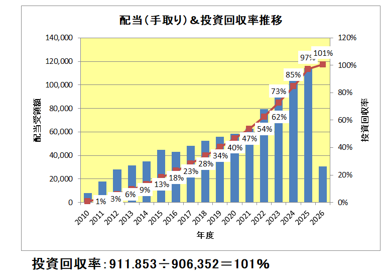 この銘柄を初めて購入したのが2009年、その後2010年、2011年と買い増ししていますが、今回の配当分を含む過去の積み上がりは以下のとおりであり、現時点での配当受領総額は91.1万円、総投資額90.6万円に対して投資回収率は101%となり、アルトリア(MO)、マクドナルド(MCD)、そして直近では昨年12月のジョンソン エンド ジョンソン(JNJ)に続きめでたく4銘柄目の100%超え銘柄となりました。(祝)