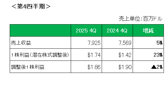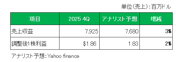 以上、第4四半期は調整後1株利益が減益となったものの市場予想を上回り、通期見通しの調整後1株利益は前期比で6%増を見込んでいるこの銘柄。