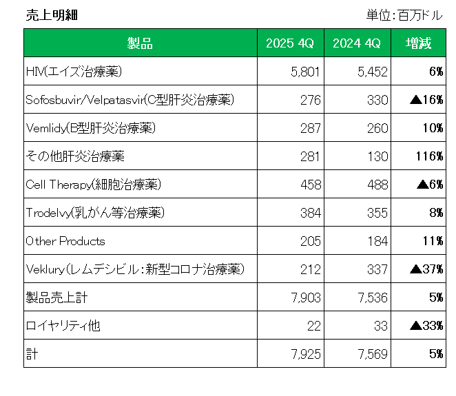 新型コロナ治療薬のVeklury(レムデシビル)が前年同期比で37%減少したものの、主力のHIV(エイズ治療薬)は6%増加したこと等により、製品売上は前年同期比で5%の増収となり、Veklury(レムデシビル)を除く売上は7%の増収となっています。