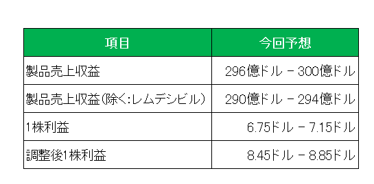 最後に注目の今期2026年の通期見通しですが、以下のとおり製品売上:296億ドル – 300億ドル、調整後1株利益:8.45ドル – 8.85ドルとしています。