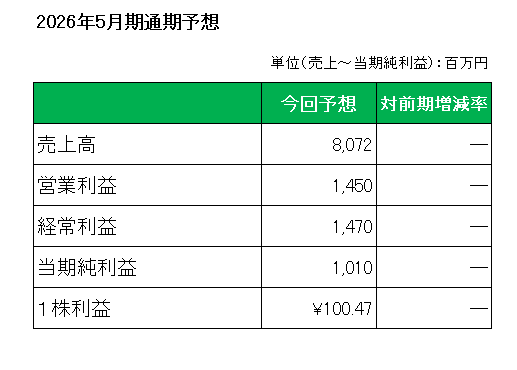 尚2025年5月26日に決算期の変更を公表、今期は前期までの3月決算から5月決算に変更しており、決算期変更の経過期間となることから2025年4月1日から2026年5月31日までの14ヶ月の変則決算となっています。(よって対前期との比較は開示していません。)