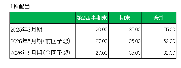そして最後に注目の配当ですが、累進配当(企業が株主に支払う配当金を毎年増配、または最低でも横ばいの水準で配当し続けること。)を方針としており、前回予想の年間62円の配当を維持、前期2025年3月期の55円に対して12.7%増配となる7円増配を予定しています。