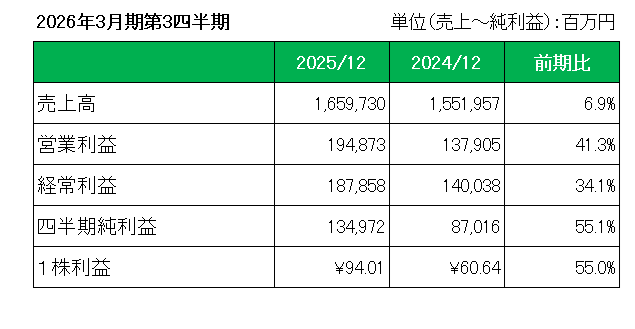 最後に配当性向40%以上としている年間配当については、2026年3月期年間(予想)配当は12.5%増配の45円(配当性向40.4%)、27期連続増配を見込んでおり前回予想から修正はありません。