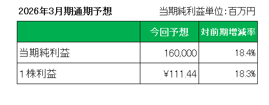 ただ注目の2026年通期予想(当期純利益)は、以下のとおり前期比18.4%(248億円)増益の1,600億円とし、前回予想を据え置いています。