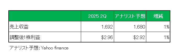 次にアナリスト予想との比較では以下のとおり売上、調整後1株利益ともに若干予想を上回っています。