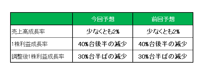 最後に注目の2025年通期見通しですが、前回予想の売上高成長率:少なくとも2%、1株利益成長率:40%台後半の減少、調整後1株利益成長率:30%台半ばの減少を維持しています。