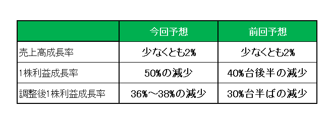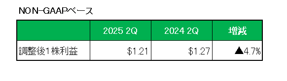 最後に注目の2025年通期見通しですが、前回予想の売上高成長率:少なくとも2%、1株利益成長率:40%台後半の減少、調整後1株利益成長率:30%台半ばの減少に対し売上高成長率は前回見通しを維持したものの、1株利益成長率:50%の減少、調整後1株利益成長率:36%~38%の減少とし、利益については見通しを引き下げています。