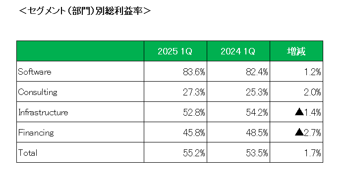 次に売上総利益率(グロスマージン)ですが、こちらはソフトウエア事業とコンサルティング事業がそれぞれ1.2%と2.0%の良化(増加)し、全体では55.2%と前年同期比で1.7%増となっています。