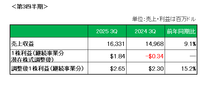 続いて1株利益は主に年金和解費用27億ドルを計上し赤字に転落した前年同期に対し会計基準ベースでは1.84ドル、また特殊要因を除いた調整後1株利益は前年同期の2.30ドルに対し2.65ドルと15.2%増となっています。