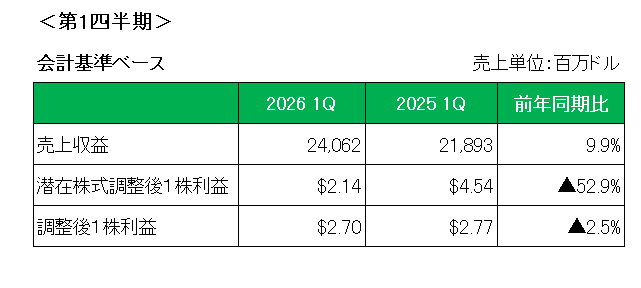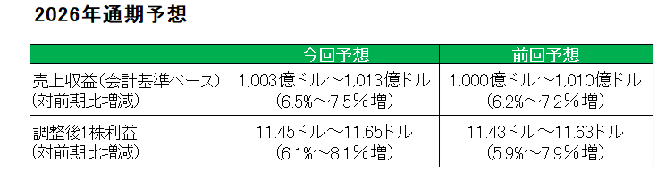最後に注目の今期2026年の通期見通しは、以下のとおり売上(会計基準ベース)、調整後1株利益共に小幅ながら前回予想を引き上げています。