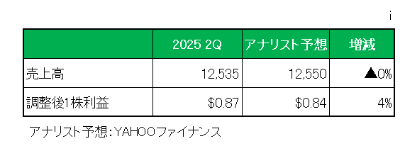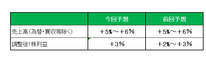 最後に注目の今期2025年通期見通し(NONーGAAPベース)ですが、以下のとおり売上(通貨変動や買収などの影響を差し引いた実質売上)は5%~6%増と前回見通しを維持したものの、調整後1株利益は前回見通しの2%~3%増から3%増へ上方修正しています。