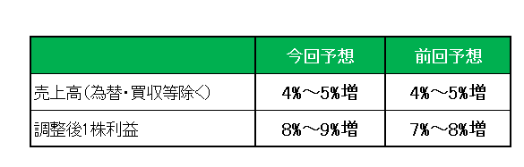 最後に注目の今期2026年通期見通し(NONーGAAPベース)ですが、以下のとおり売上(通貨変動や買収などの影響を差し引いた実質売上)は前回見通しの4%~5%増を据え置いたものの、炭酸飲料やその他の飲料への需要がエネルギー価格高騰に伴う容器不足の影響を補うと見込んで、調整後1株利益は前回見通しの7%~8%増に対し8%~9%増へと引き上げています。