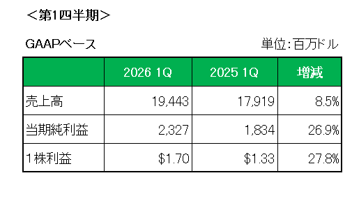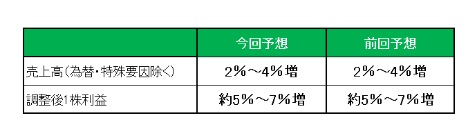 最後に注目の今期2026年通期見通し(NONーGAAPベース)ですが、地政学的対立が続いているためマクロ経済環境がより不安定で不透明になっていることもあり、以下のとおり前回見通しを維持、売上(通貨変動や買収などの影響を差し引いた実質売上):2%~4%増、調整後1株利益:約5%~7%増としています。