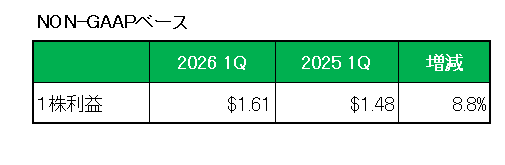 次に1株利益ですが、会計基準ベースでは前年同期比27.8%増、そしてデリバティブの時価評価等の特殊要因を除いたNON-GAAPベースの1株利益は生産性向上によるコスト削減、売上高の増加、およびドル安等によって以下のとおり前年同期の1.48ドルに対し1.61ドルと8.8%の増益となっています。
