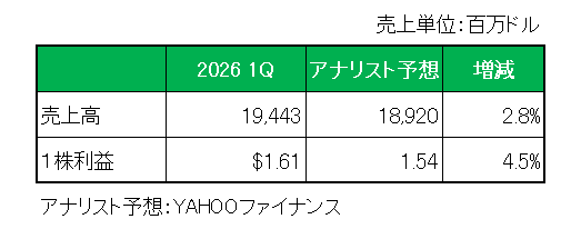 そしてアナリスト予想(FactSet consensus) との比較では以下のとおり売上、調整後1株利益ともに予想を上回っています。