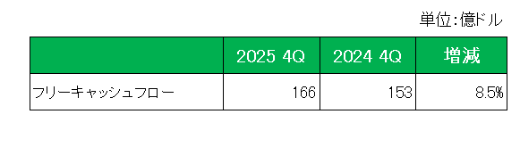 そして配当の源泉として注目のフリーキャッシュフローは、第4四半期は前年同期の40億ドルに対し42億ドルと5%増、また年間のフリーキャッシュフローは以下のとおり前期の153億ドルに対し166億ドルと8.5%増となっています。