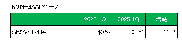 次に利益ですが、会計基準ベースの1株利益は前年同期の0.61ドルに対し、0.54ドルと11.5%減となりましたが、これは主に前期においては関連会社持分利益が大きかったためであり、特殊要因を除いた調整後1株利益は以下のとおり0.57ドルと前年同期の0.51ドルに対し11.8%増となっています。