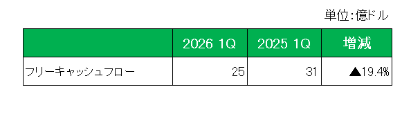 一方配当の源泉として注目のフリーキャッシュフローは、前年同期の31億ドルに対し25億ドルと19.4%減となったものの、会社予測(20億〜25億ドル)の上限に達しています。