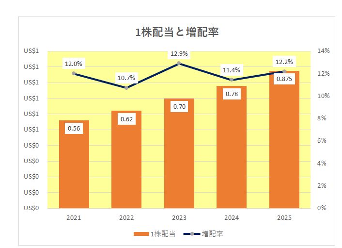 御覧のとおり毎期10%を超える増配を継続しており、見事と言うしかありません。