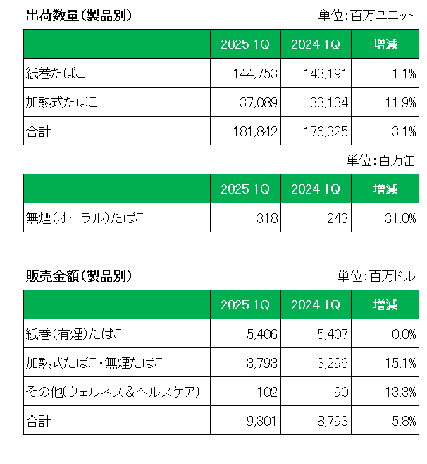 これを製品別の出荷数量・金額で見ると以下のとおり紙巻きたばこは数量ベースで2024年第4四半期と同増加率の1.1%増。