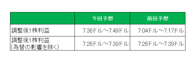 最後に注目の今期2025年の調整後1株利益の通期見通しは、以下のとおり為替の影響により前回予想の7.04ドル~7.17ドル(2024年実績6.57ドルに対して7.2%~9.1%の増益予想)を7.36ドル~7.49ドル(2024年実績6.57ドルに対して12%~14%の増益予想)に上方修正しています。