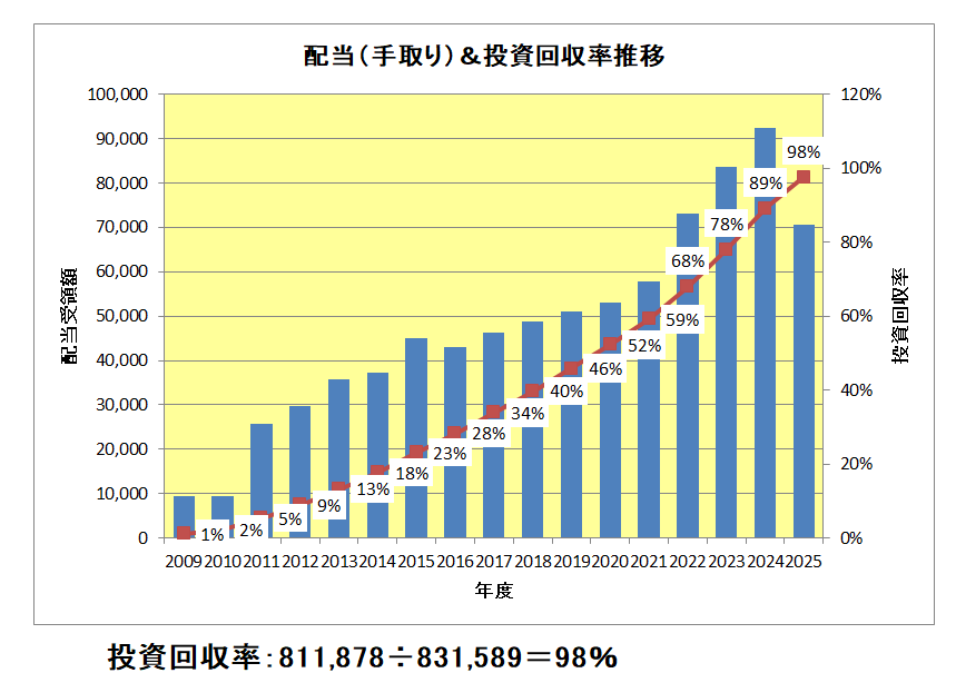 これまでの配当金の積み上がり状況は以下のとおりとなっており、総投資額83.1万円に対する総配当受領額は81.1万円、投資回収率は98%にまで達しており、現在の為替を前提とした場合、年内の100%達成が確実な状況となっています。