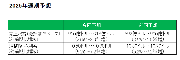 そして注目の今期2025年の通期見通しは以下のとおり、売上(会計基準ベース)はイントラセルラー・セラピーズ社買収完了により前回見通しの892億ドル~900億ドル(対前期比0.5%~1.5%増)に対し、910億ドル~918億ドル(対前期比2.6%~3.6%増)と上方修正していますが、利益(調整後1株利益)は前回見通しの10.50ドル~10.70ドル(対前期比5.2%~7.2%増)を維持しています。