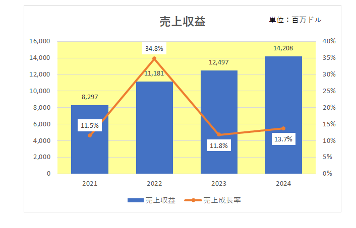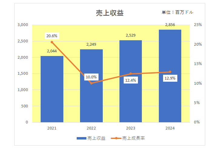 また、以下は2021年以降4年間の売上と成長率の推移となりますが、毎期当たり前のように二ケタ増収を達成中。