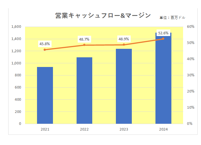 そして本来の稼ぐ力を表す営業キャッシュフローマージンも右肩上がりとなっているばかりか、そのマージンは毎期45%を超え直近2024年12月期では50%超えと驚異的な数字となっています。