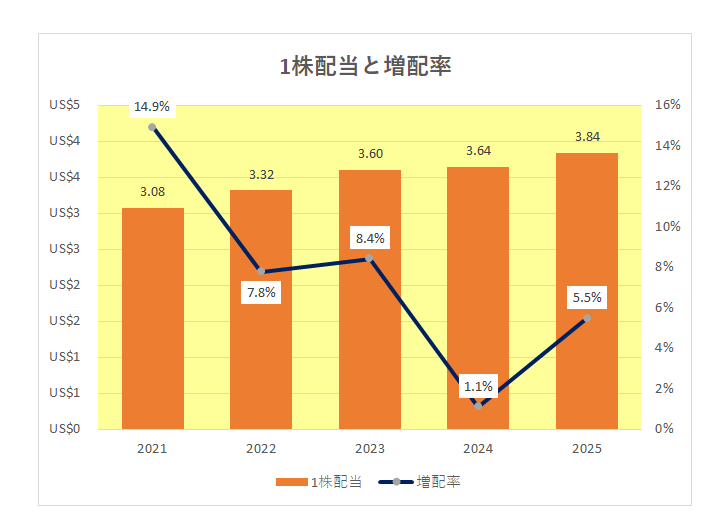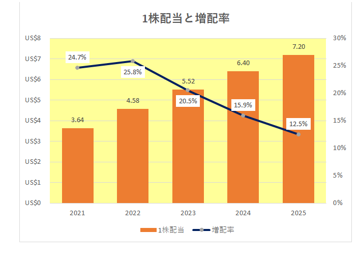 ということで、以下は2021年から2025年までの配当金額と増配率の推移となりますが、増配率は右肩下がりの傾向となってはいますが、注目はその数字。