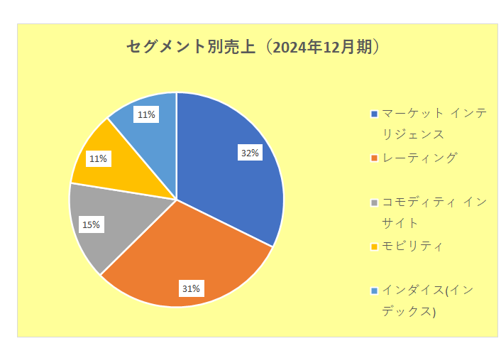 以下はセグメントの内容と2024年12月期のセグメント別売上となりますが、インダイス(インデックス)はわずか11.2%にしかすぎず、マーケット インテリジェンスとレーティングで全体の6割を超え中心となっていることがわかります。