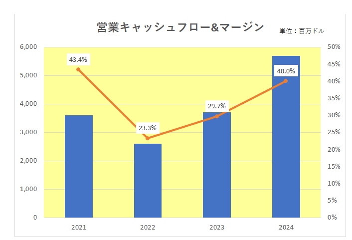 一方本来の稼ぐ力を表す営業キャッシュフローマージンは、2022年には新型コロナのパンデミックの影響もあり大きく落ち込みましたが、その後は右肩上がりとなっており直近2024年12月期では40%にまで戻しています。