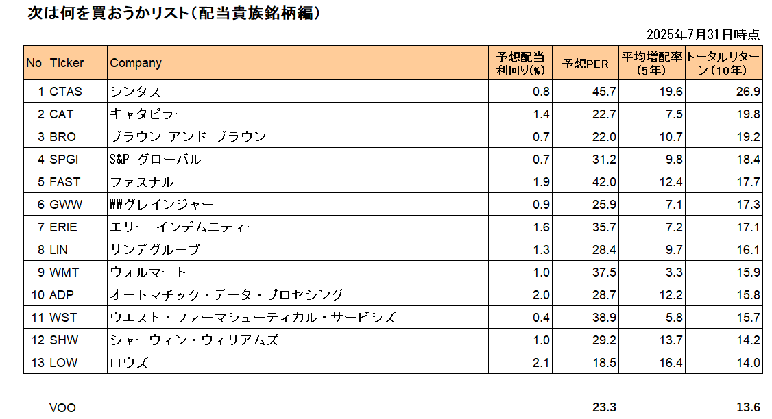「次は何を買おうかリスト(配当貴族銘柄編)」をアップデートしました。(2025年7月末時点) 皆さんの銘柄選びの参考になれば幸いです